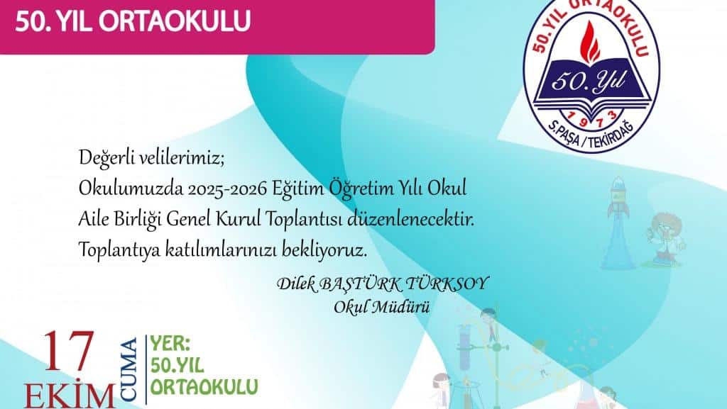 Okul Aile Birliğinin Olağan Genel Kurul toplantısı 17.10.2025 Cuma günü saat 15.30'da yeterli çoğunluk sağlanamadığı durumda ise 24.10.2025 Cuma günü saat 15.30'da okulumuzun toplantı salonunda yapılacaktır.